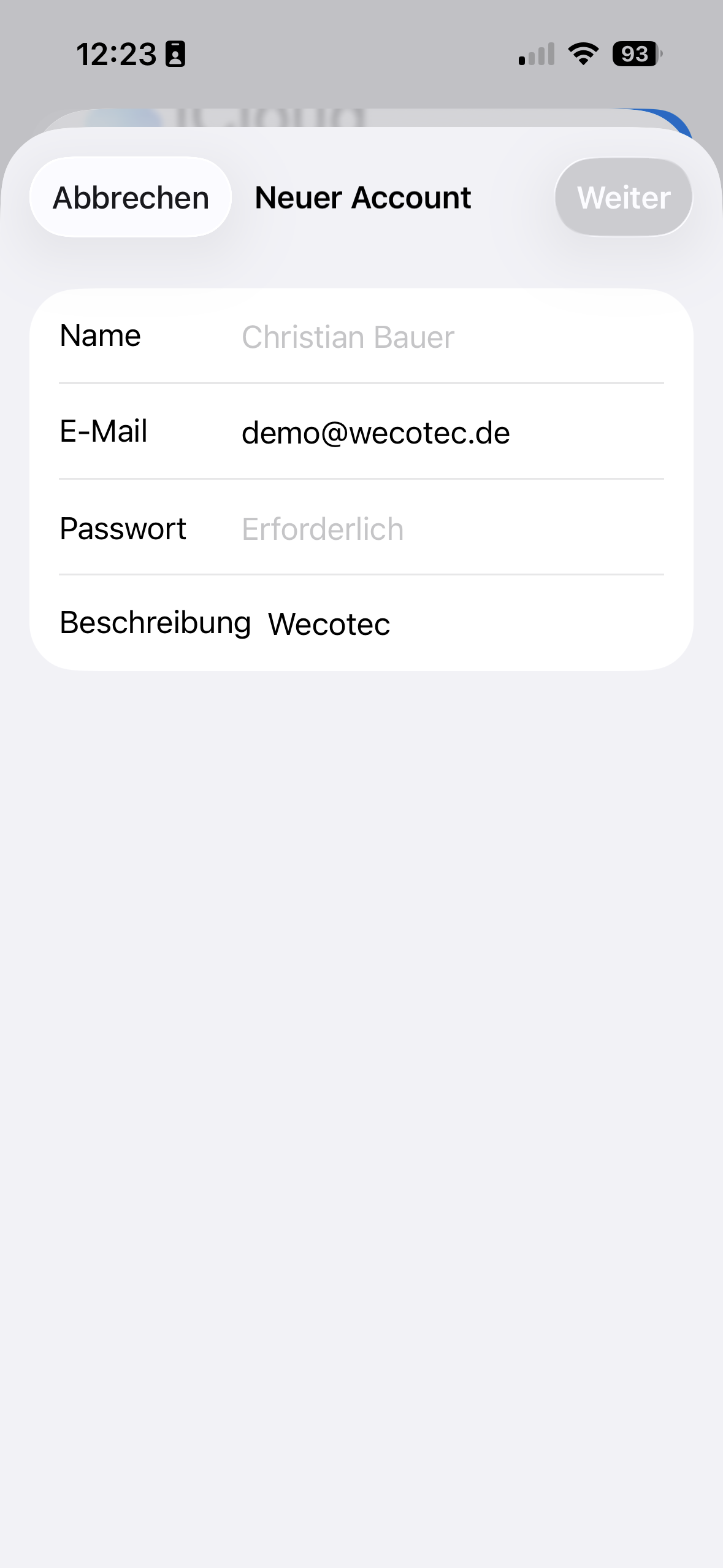 Bei den Feldern “Server für eintreffende E-Mails” und “Server für ausgehende E-Mails” tagen Sie jeweils “wecotec.email” ein und klicken auf “anmelden”.