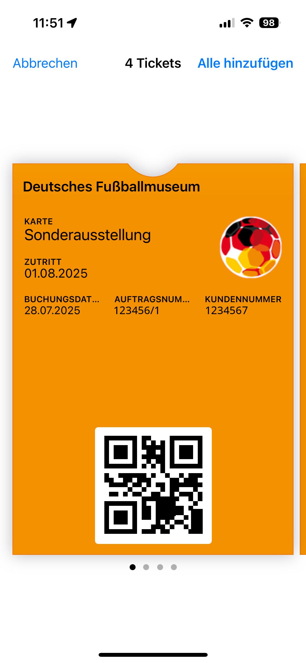Besonders hervorzuheben ist das Android-Wallet des Deutschen Fußballmuseums in Dortmund, das parallel unterstützt wird. So können Gäste unabhängig vom verwendeten Betriebssystem auf denselben Komfort zugreifen. Die Tickets werden beim Kauf automatisch als digitale Wallet-Pässe generiert und per E-Mail bei Bestellabschluss verschickt.